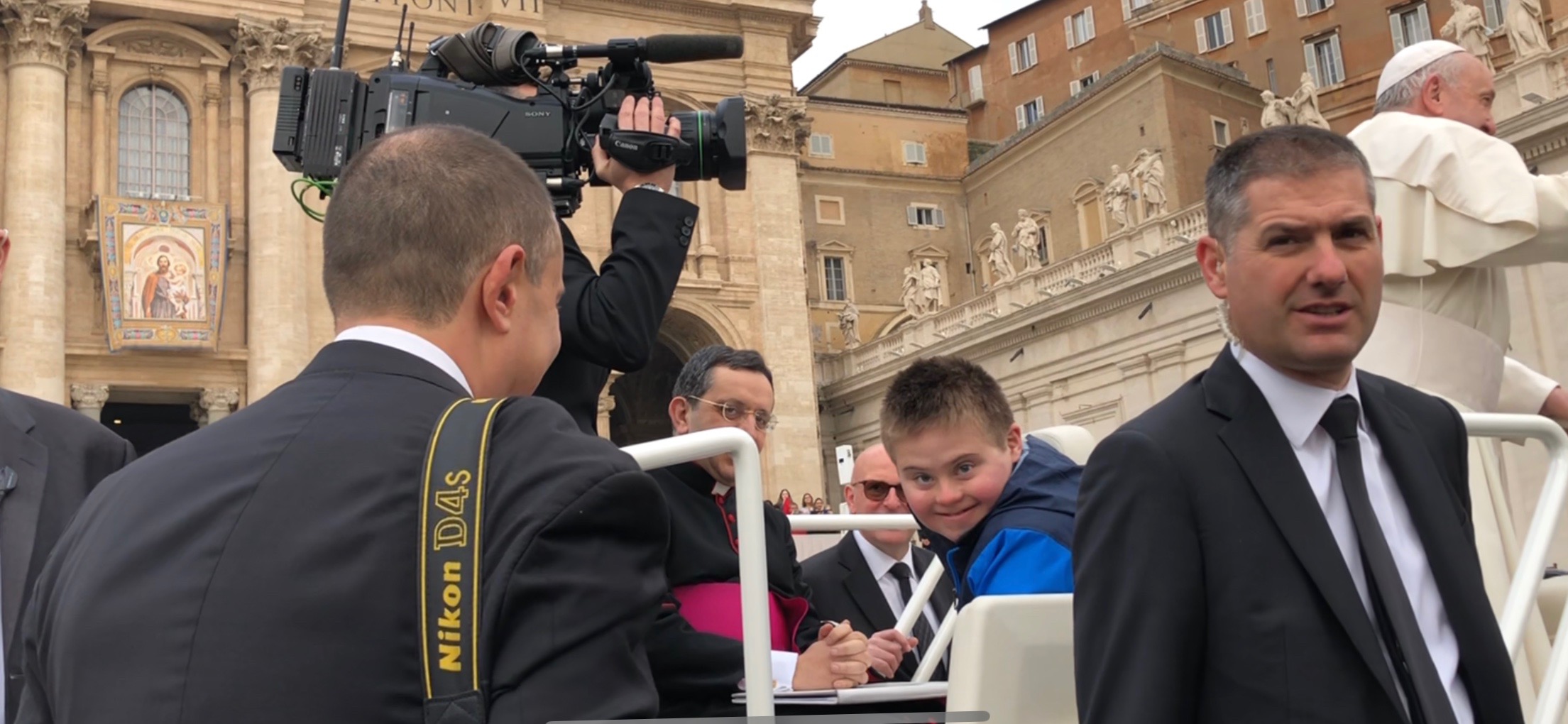 While this guarantees a great view, it doesn’t guarantee a kiss. But the family could not have been more grateful. When the Holy Father started his ride around the piazza, he immediately saw Peter and stopped right in front us, had security pick him up, gave him a kiss, and then asked if Peter would like to stay in the car.
