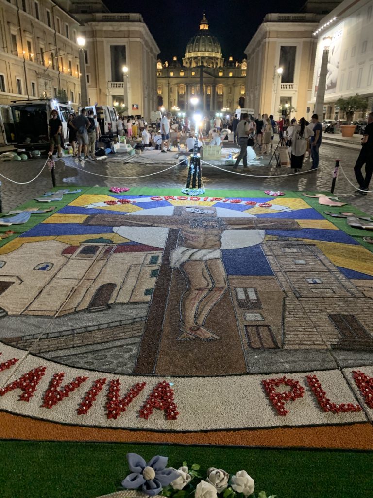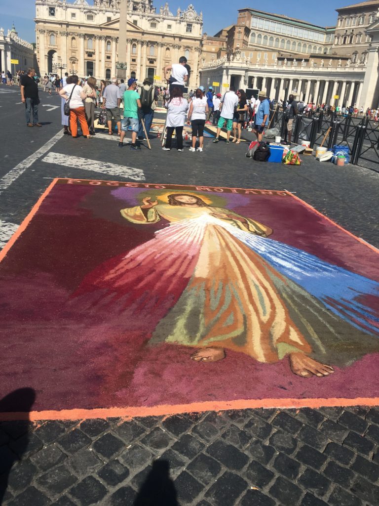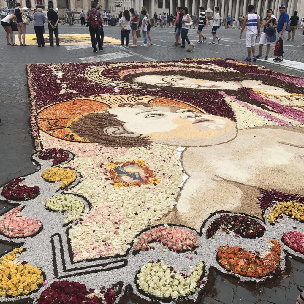 Each year for the Feast of Saints Peter and Paul, different towns around Italy will decorate the street leading up to the basilica with floral art – many also use colored sand and saw dust – called infioratori. The artists work all night. By late morning or early afternoon, the wind and the birds will take everything away.