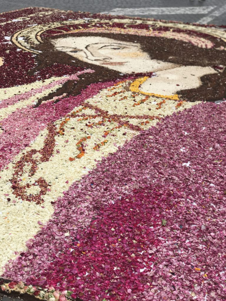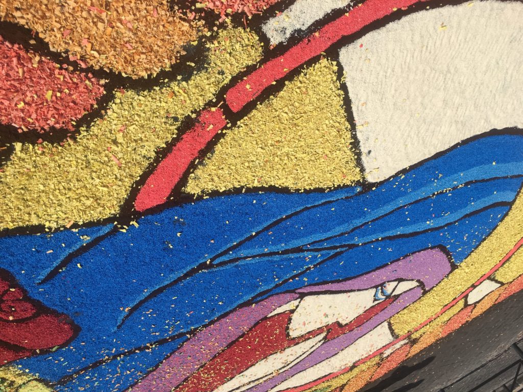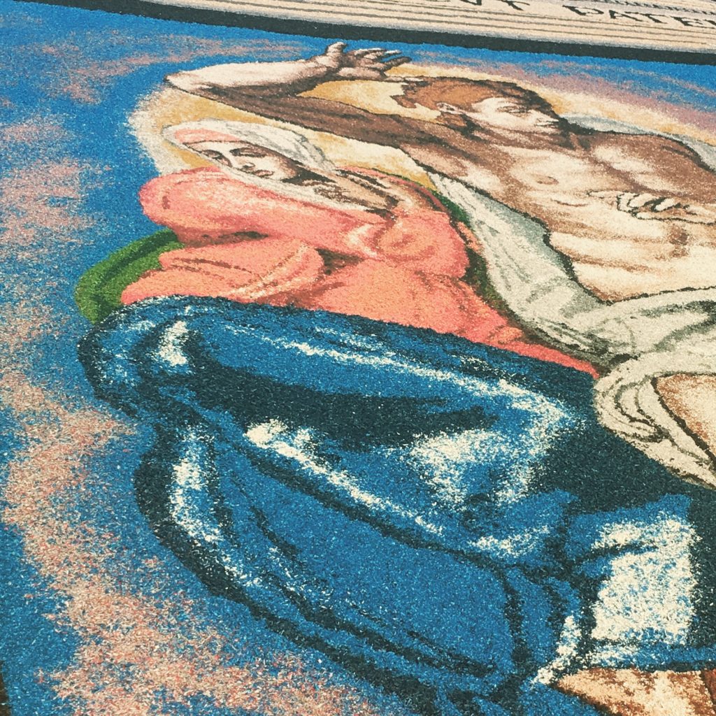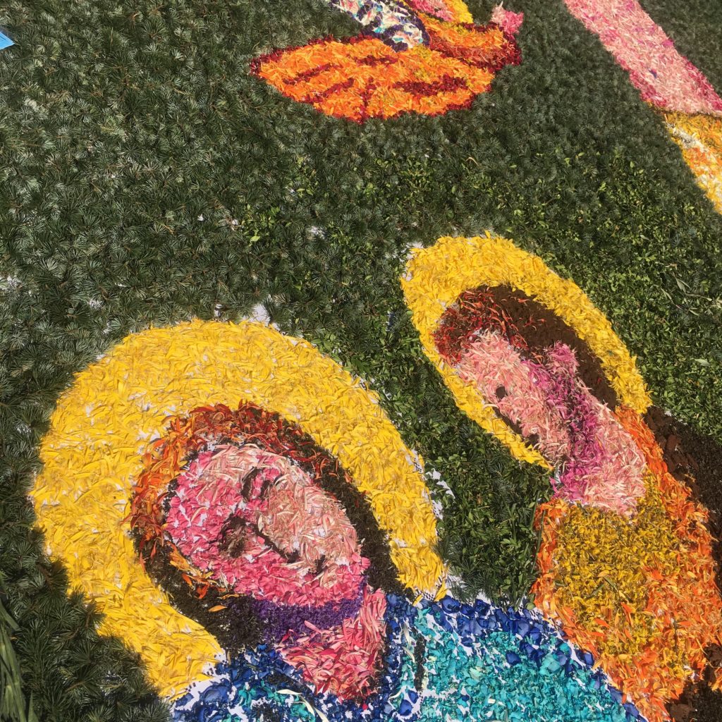 Each year for the Feast of Saints Peter and Paul, different towns around Italy will decorate the street leading up to the basilica with floral art – many also use colored sand and saw dust – called infioratori. The artists work all night. By late morning or early afternoon, the wind and the birds will take everything away.