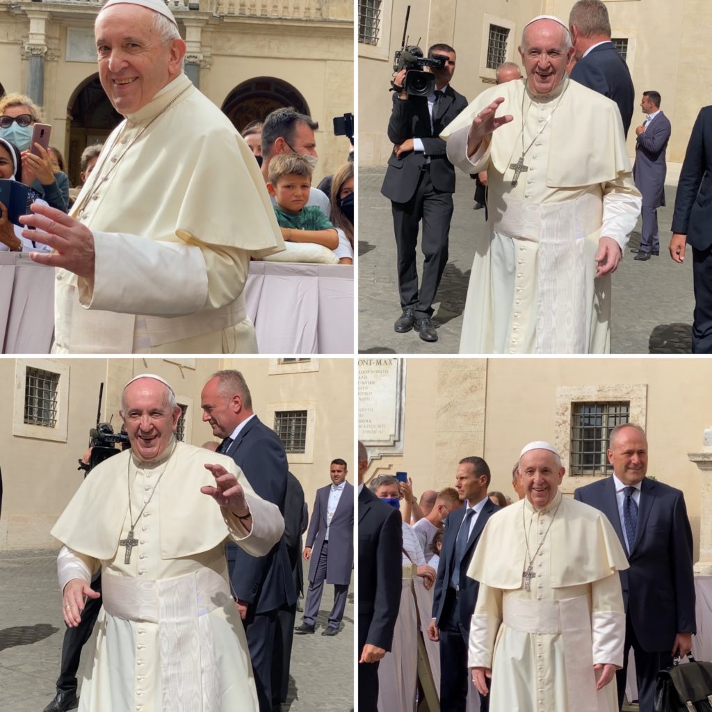 For those interested in attending an Audience in the Cortile San Damaso, currently no tickets are required. Just show up for security in front of Saint Peter’s Square by 7:30 AM on Wednesday. You’ll be escorted through the Bronze Doors and into the Courtyard. The Holy Father arrives around 9:30 AM and it’s over around 10:30 AM. If you don’t get to meet him on the way in, wait for the end as he walks out.